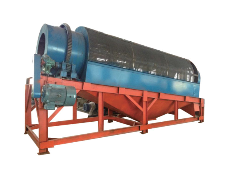 滚筒筛由电机、减速机、驱动联轴器、轴承支座和筛笼等组成,滚筒装置倾斜安装于机架上。电动机经减速机与滚筒装置通过联轴器连接在一起,驱动滚筒装置绕其轴线转动。当物料进入滚筒装置后,由于滚筒装置的倾斜与转动,使筛面上的物料翻转与滚动,使合格物料(筛下产品)经滚筒后端底部的出料口排出,不合格的物料(筛上产品)经滚简尾部的排料口排出。由于物料在滚筒内的翻转、滚动,使卡在筛孔中的物料可被弹出,防止筛孔堵塞。生产率:一般在50-150吨/时,视网孔大小及进料量而论,网孔大、进料多则生产率就高。