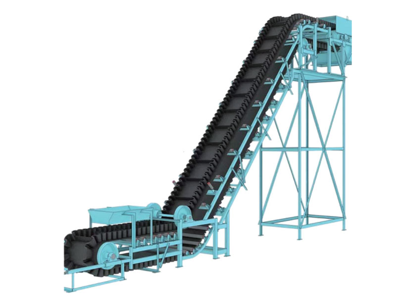 大倾角挡带式输送机其结构是在平形橡胶运输带两侧粘上可自由伸缩的橡胶波形立式“裙边”,在裙边之间又粘有一定强度和弹性的横隔板组成匣形斗,使物料在斗中进行连续输送。