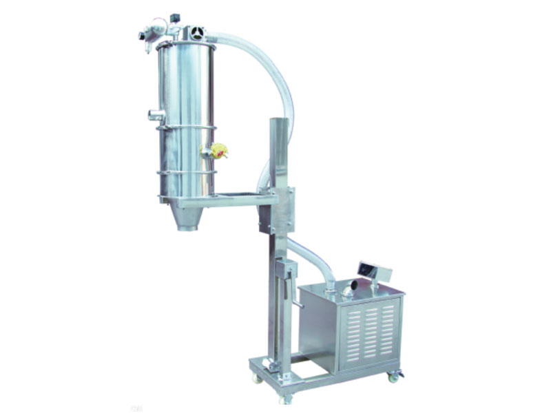 真空加料机中装有压缩空气反吹装置,每次放料时,压缩空气脉冲反吹过滤器,把吸附于过滤器表面的粉末打落下来,以保证吸料能正常运行。